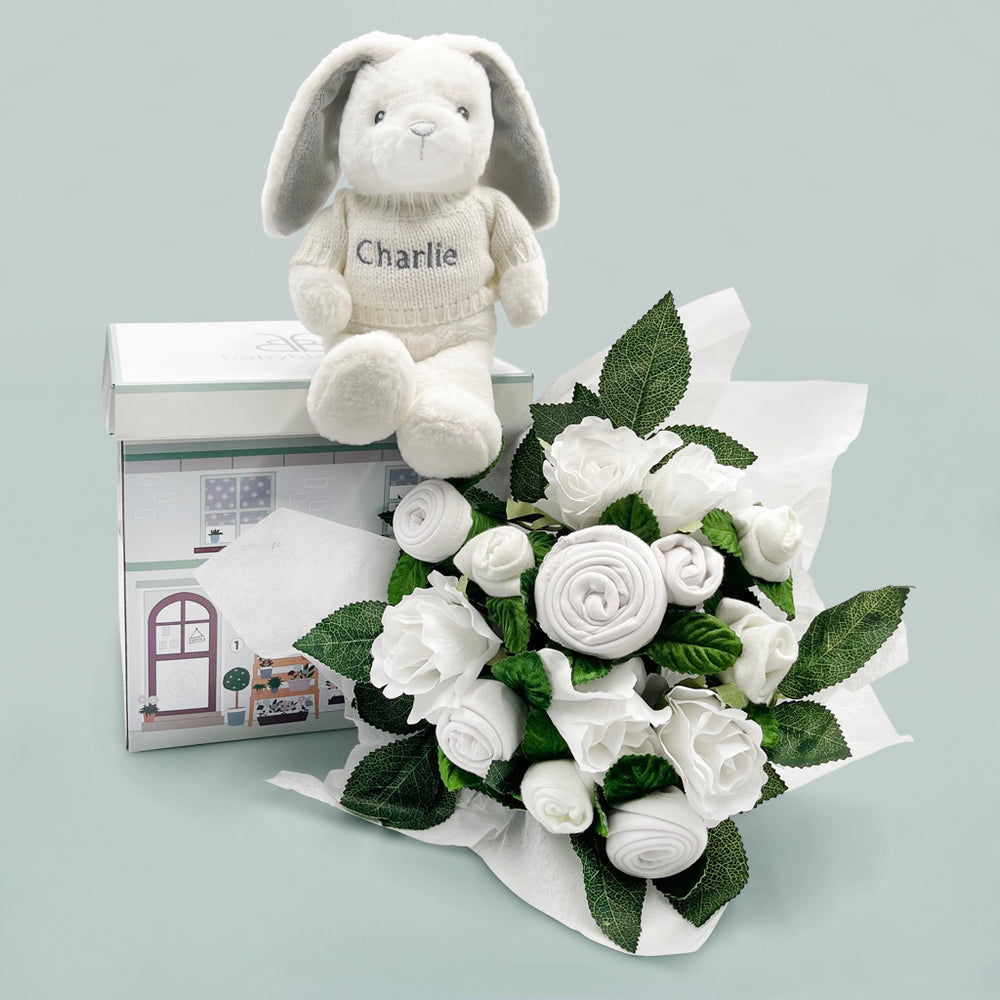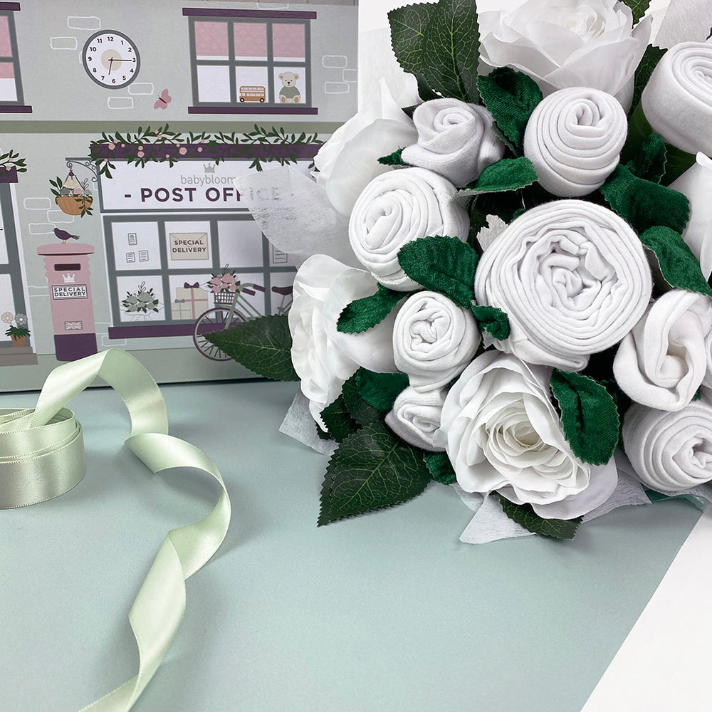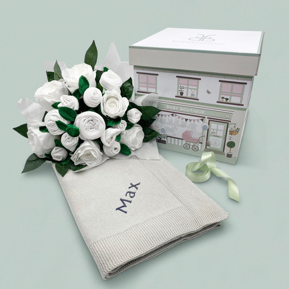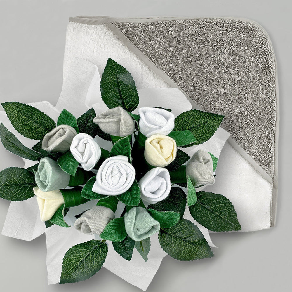 All of our baby clothes bouquets include delicate silk flowers and foliage, which can be treasured forever, together with perfect roses of our exclusive baby clothes. We take tiny baby bibs, sleepsuits, hats, socks, mittens and bodysuits and cleverly roll them to resemble fresh flowers. We then create a stunning baby clothes bouquet that is both a beautiful and practical gift for a new mum. Just as gorgeous as fresh flowers, our baby clothes bouquets will last forever and makes a thoughtful and memorable gift for a new baby. Our unisex baby clothes bouquets make a perfect gift for before baby is born, and you are not sure whether baby is a boy or a girl. Our baby clothes bouquets come in beautiful tones of classic white, grey and green are gender neutral for anyone who prefers a more subtle colour palette.