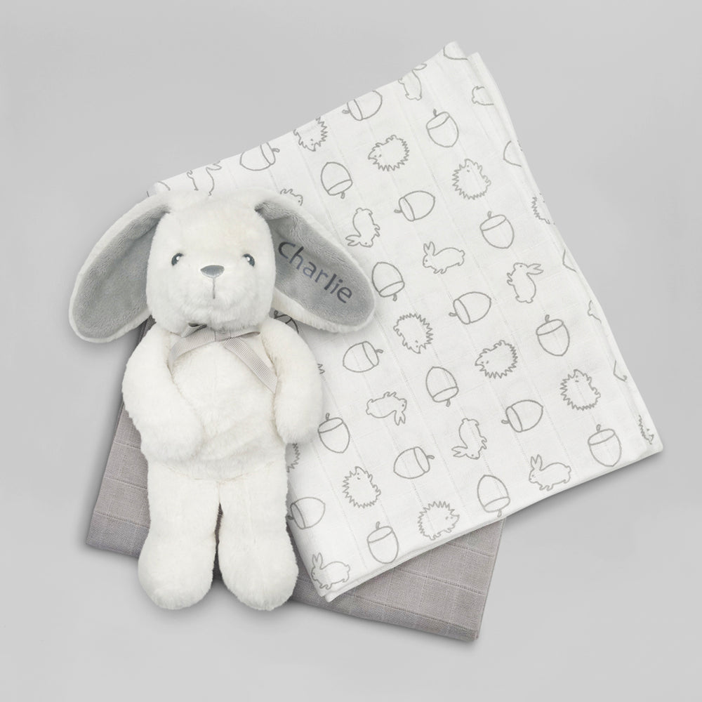 The contents in these unisex baby gift baskets vary to suit all budgets and occassions. Contents may include our 100% cotton knitted baby blankets in white or grey, little grey bunny soft toys and traditional teddy bears as well as our classic white baby clothes bouquets. Several of our hampers also include to option for personalisation.